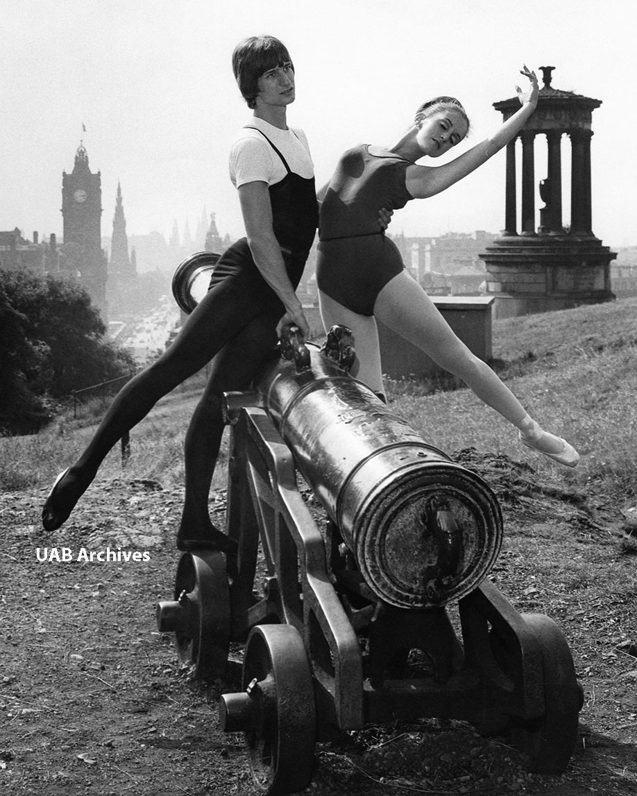 During the summer of 1969, several members of the Alabama Ballet spent the summer dancing and studying in Europe, with visits to Scotland, Italy, and Switzerland. In Scotland, Helen Dexter and Larry Bailey were photographed on Calton Hill with the Dugald Stewart Monument and the city of Edinburgh in the background. At the time of this European tour, the Alabama Ballet was an affiliate of UAB and was under the direction of faculty member James F. Hatcher, founding director of the UAB Town and Gown Theatre.Image ID: PMC16 #0459