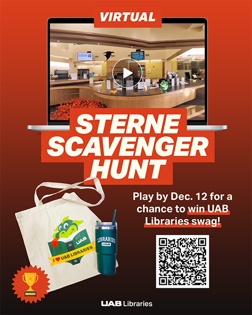 After completing the scavenger hunt, participants can enter their email for a chance to be win UAB Libraries swag, including a 3D-printed object made in the LibLab @ Sterne; three winners will be selected randomly after the scavenger hunt closes Dec. 12, and winners will be notified via email. Only participants with a current BlazerID are eligible to win.