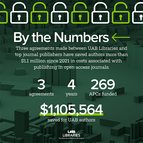 Three agreements made between UAB Libraries and top journal publishers have saved authors more than $1.1 million in costs associated with publishing in open access journals since 2021.