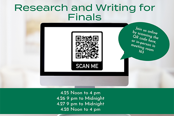 Are you stressed about finals? Do you need a study break? Or maybe some help finalizing your research paper? Can't make it to the library? Join us online OR in Sterne Library during finals, from April 25th to April 28th.