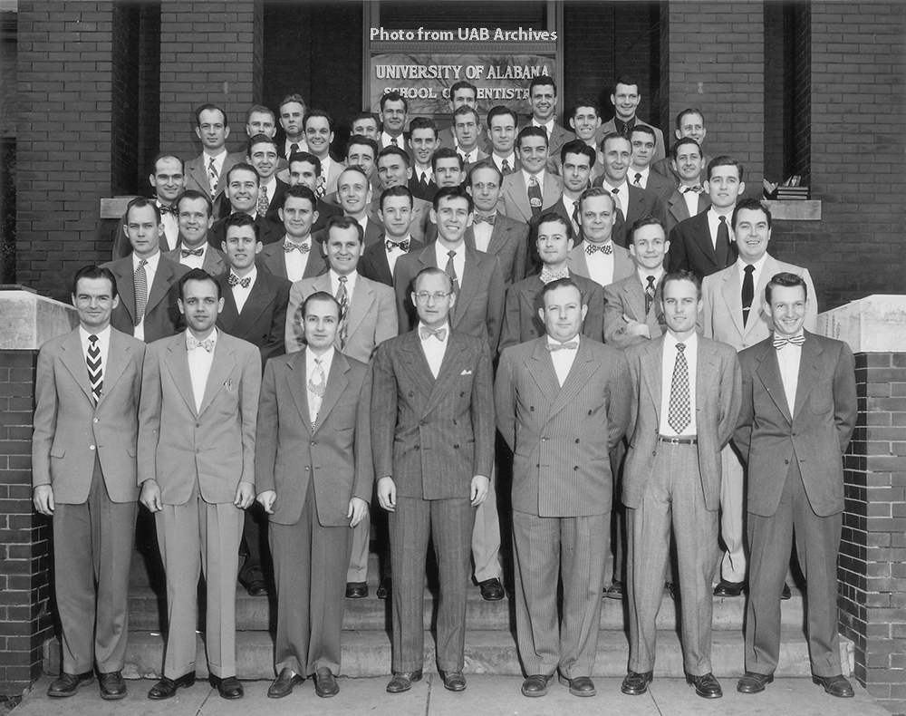 October 2023 Image of the MonthRecruited to Birmingham by Dr. Joseph F. Volker, founding dean of the dental school, the 52 members of the first class of the School of Dentistry were all veterans of World War II. The students began studies in the new dental school on October 18, 1948. With no stand-alone home, the dental school was initially housed in the Hillman buildings of the hospital complex and it would remain there until 1951 and the completion of a new building. Fifty members of the inaugural class would graduate on May 31, 1952; Walter C. Andrews, Jr., was the school's first graduate.