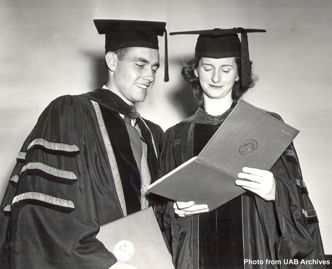 October 2006 Image of the MonthHomer W. Allgood, Jr., and Virginia D. Hamilton examine a diploma from the medical school's first commencement in Birmingham. Allgood was the first person to receive a diploma at the ceremony and Hamilton was the first female in the history of the medical school to receive the MD degree.