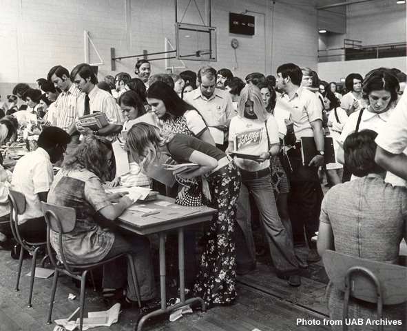 August 2006 Image of the MonthUniversity College registration, September 1972. Registration for University College was held in the gymnasium of UAB's Bell Building. A total of 7,564 students enrolled in credit and non-credit courses during the two-day registration on September 21-22. Before the days of personal computers and online registration, UAB students would queue for their classes at tables placed around the gym.