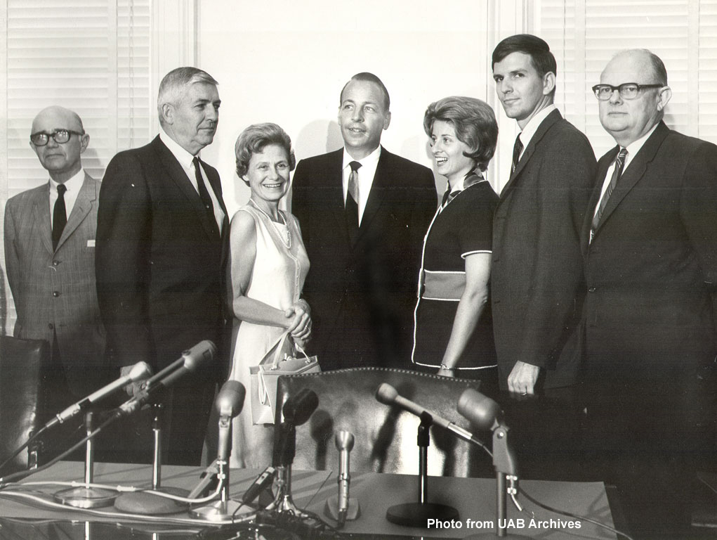 September 2006 Image of the MonthAt a press conference in Montgomery, Governor Brewer announced that the "University of Alabama in Birmingham" and the "University of Alabama in Huntsville" would become independent campuses and join the University of Alabama in a new three-campus administrative system. Meeting with the media are (left to right) Daniel T. McCall, Jr., member of the University of Alabama Board of Trustees; Dr. Joseph F. Volker, newly named president of UAB; Juanita Volker; Governor Brewer; Mary Mathews; Dr. F. David Mathews, president of the University of Alabama; and J. Rufus Bealle, Board secretary. Following a search process, Dr. Benjamin B. Graves would be named the first president of UAH in 1970.