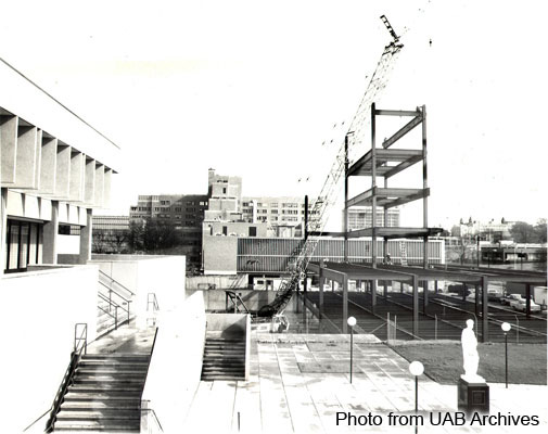 April 2008 Image of the MonthThe steel structure of a building to house the School of Optometry rises on the UAB campus. The optometry building was dedicated on September 12, 1975 ; it would be renamed the Henry B. Peters Building in 1994 in honor the school's founding dean. In this view looking east from Volker Hall, the Statue of Hippocrates is visible in the original courtyard that was located in front of the Lister Hill Library of the Health Sciences.