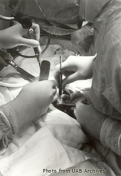 May 2008 Image of the MonthThe first kidney transplant in the state of Alabama was conducted at the Medical Center in Birmingham on May 8, 1968. Dr. Arnold G. Diethelm performed the surgery and headed the transplant team. In the 40 years since that first surgery, UAB has grown to be one of America's top transplant centers with patients arriving from around the globe for treatment. Currently, the university has active programs in kidney, heart, liver, lung, bone marrow, pancreas, cornea and retina transplantation.