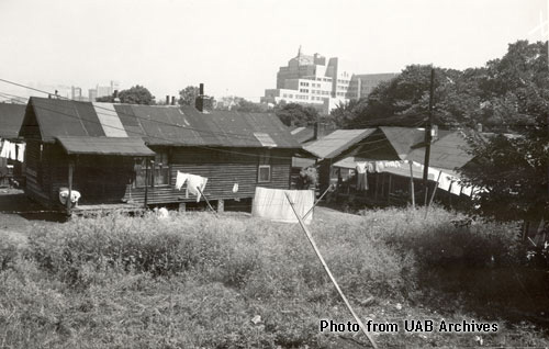 On June 10, 1958 university officials obtained 10 ½ blocks of land adjacent to the Medical Center. The Urban Renewal Project allowed the campus to grow west from its original four blocks. This photograph of the 800 block of South 17th Street – the site currently occupied by the Learning Resources Center – clearly illustrates the substandard conditions found immediately west of the campus. University Hospital and the Veterans Administration Hospital are visible in the background.