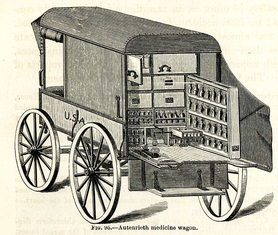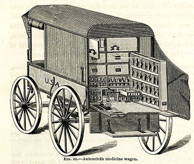 Image: United States Army medicine wagon from the Civil War; [From] Reports on the extent and nature of the materials available for preparation of a medical and surgical history of the Rebellion. United States Surgeon General's Office, Circular No. 6, 1865; Reynolds-Finley Historical Library Arnold G. Diethelm American Civil War Medicine Collection.