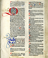 Sm. fol. Ff. [196]. Quire A and leaf g5-6 missing. Margins of [B]2 recto illuminated in gold, green, blue and lavender. 7 illuminated initials. Other initials, paragraph marks and designs in red.