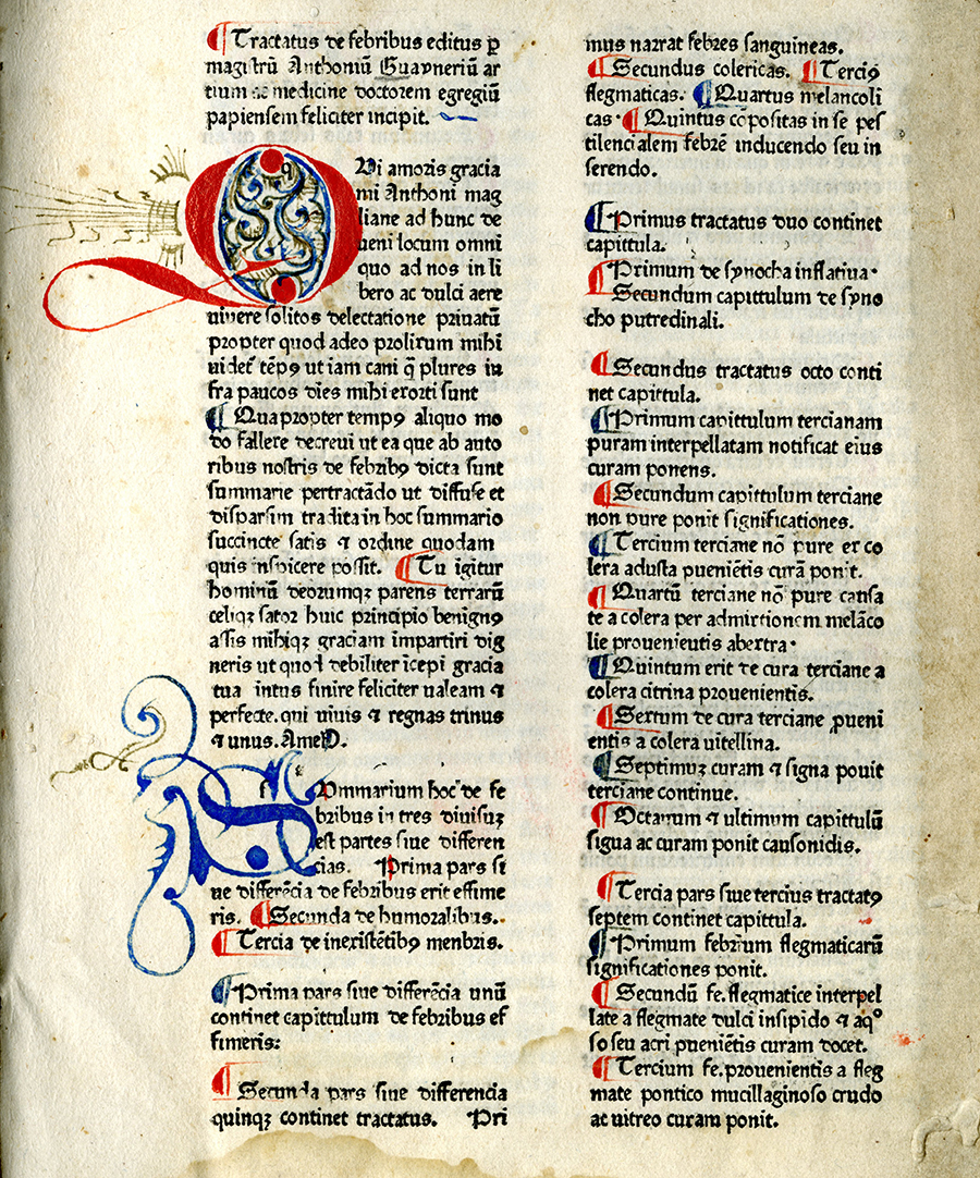 Rubricated first leaf of Tractatus de febribus (1474), by Antonius Guianerius - Gentilis de Fulgineo, -1348.