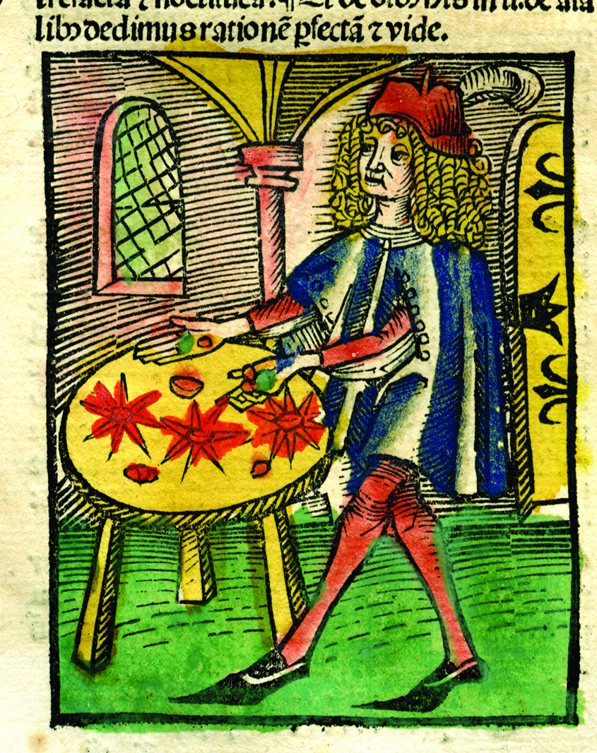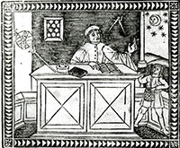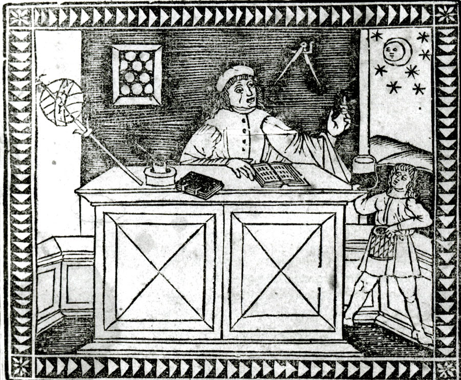 Woodcut depicting Arnold of Villanova at his desk with the tools of his trade around him and a boy handing him a uroscopy flask, Regimen Sanitatis (c. 1500) - Rodericus Zamorensis, 1404-1470.