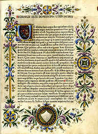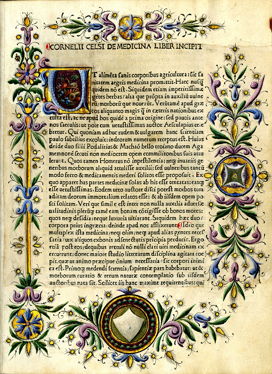 Illuminated initial and margins on the first leaf of Celsus’ De Medicina (1478) - Celsus, Aulus Aurelius Cornelius, 25 B.C.-50 A.D.