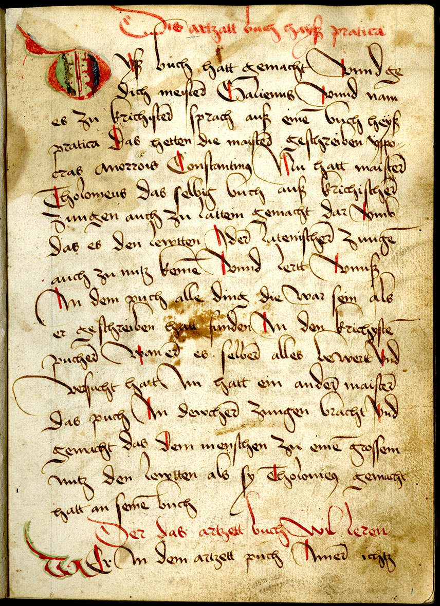 Leaf 1 recto, from Dis Artzatt Buch Gross Pratica (1489)During the Early Middle Ages, also known as the "Dark Ages" (from the fall of the Roman Empire to about 1000 A.D.), when ancient Greco-Roman knowledge and culture was neglected and nearly forgotten in Europe, the Arabs preserved and built upon the scholarship of the great medical writers of the classical world, such as Galen (129-199 AD) and Hippocrates (c. 460-370 BC). Greek culture still flourished in the Near East when the Arabs migrated to the area from Syria in the 7th century. Later they took Greek medical texts into Persia and other parts of the Middle East, translating them first into Syriac, and then into Arabic.