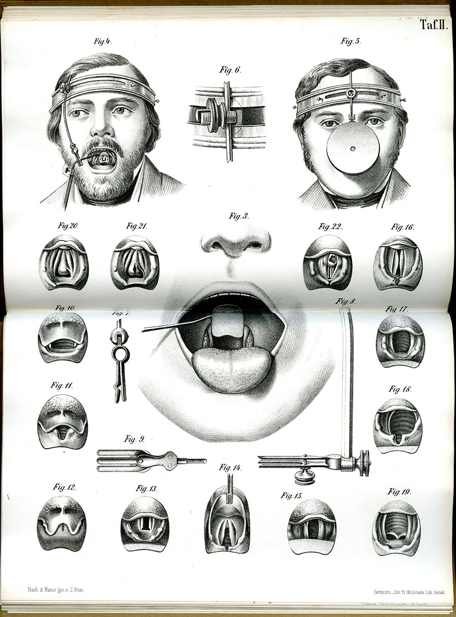 These illustrations of laryngoscopic instruments and views of the throat come from Die erste Ausrottung eines Polypen in der Kehlkopfshöhle (1862), by Victor von Bruns.On October 26, 2010, the Reynolds-Finley Historical Library received 125 rare and historical books related to the history of otolaryngology. The donation included important works by Casserio from 1601, Capivaccio from 1603, Aetius of Amida from 1549, and Conrad Schneider from 1664, as well as valuable works on the anatomy and diseases of the ear, nose and throat from the 18th and 19th centuries. This material, collected by Dr. Dennis G. Pappas, was formerly at the American Academy of Otolaryngology in Alexandria, Virginia, but has now come to Historical Collections at UAB for inclusion as a specially designated “Dennis G. Pappas Otolaryngology Collection” in the Reynolds-Finley Historical Library. This large acquisition of rare materials augmented books already donated by Dr. Pappas in this specialty, and he has continued to add to the collection since then.