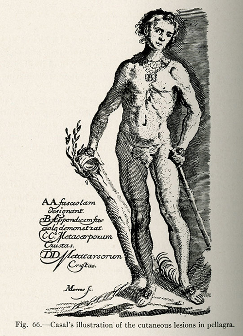 Gaspar Casal’s illustration of pellagra’s cutaneous lesions around the collar.His experiences treating pellagrins prompted a three-volume work, De Pellagra (1786-89), in which he proves that pellagra is not merely a skin disease by showing that it can occur without characteristic dermatitis. Strambio attributes the cause of pellagra to spoiled bread and polenta. In 1869 another Italian, Cesare Lombroso (1836-1909), initiated the theory that pellagra is caused by a toxin in deteriorated maize.