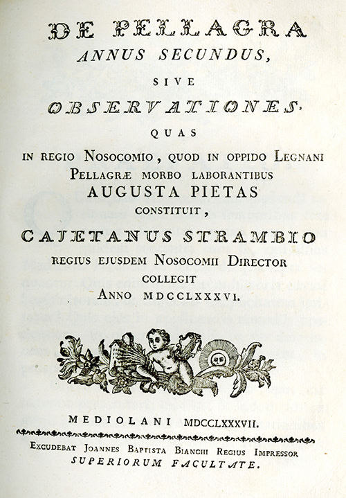 Title page from the 2nd volume of Gaetano Strambio’s De Pellagra. Click here to view all 3 volumes.Pellagra, a nutritional deficiency disease caused by the lack of vitamin B3 (niacin) in the diet, is characterized by the four-d’s: dermatitis, diarrhea, dementia, and in some cases death. It is a global disease affecting places where the population diet is primarily maize-based. First described in Spain by Gasper Casal y Julian in 1735, it remained endemic in Southern Europe and the Mediterranean for close to two hundred years before it was recognized in the U.S. in the early 20th century.